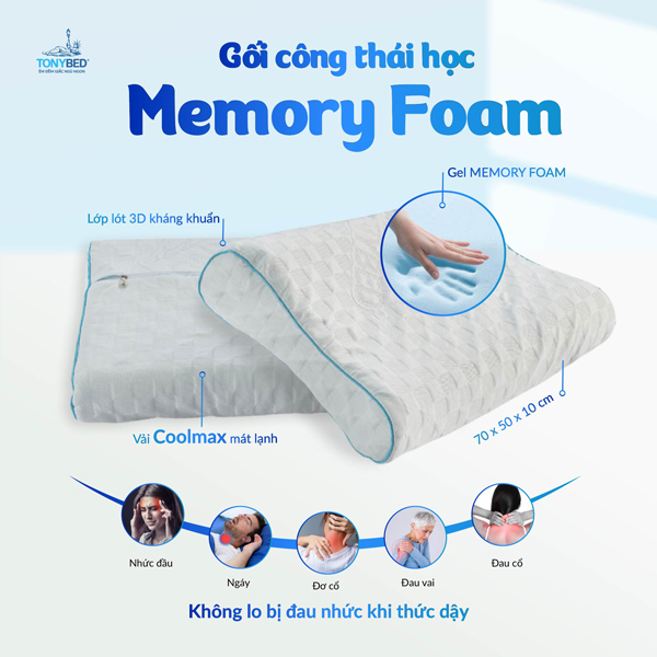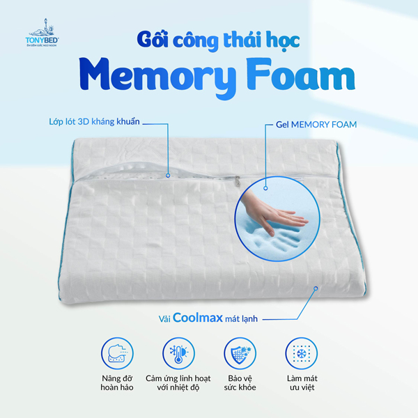- Đặc biệt gối công thái học memory foam Tonybed thích hợp cho người thích nằm gối thấp và mềm.